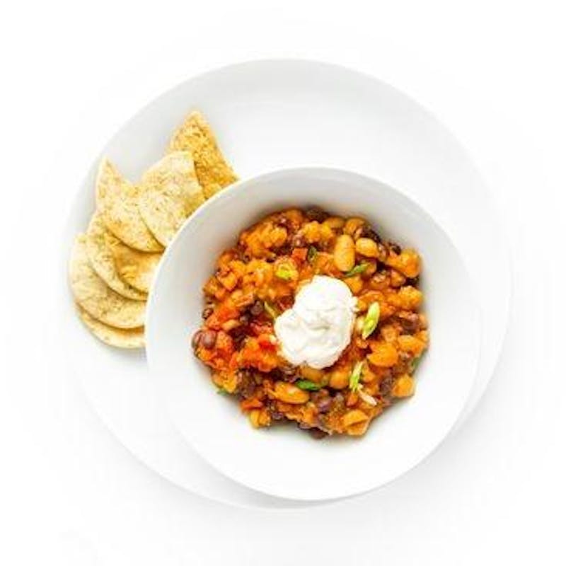 This plant-based chili is spicy and complex. A mix of legumes are stewed with Mediterranean spices to create a comforting yet new take on everyone’s favorite chili. A drizzle of creamy tahini on top is refreshing, and savory crunchy pita chips on the side are perfect to dip or crush on top for added texture.
