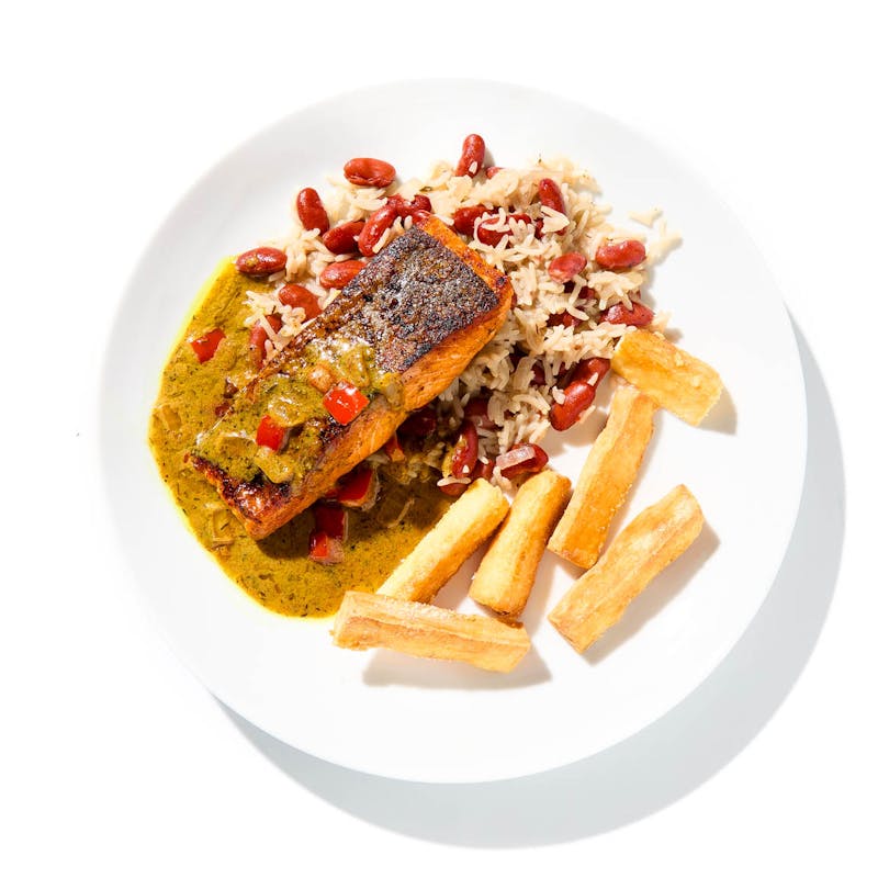 Treat yourself to Chef Angelia's roasted salmon with creamy coconut curry, paired with tostones and red beans and rice. The salmon is simply cooked to tender perfection, while the Caribbean-inspired coconut curry adds a flavor-packed, aromatic element that perfectly complements the salmon. The tostones provide a crunchy pop of texture, while a side of red beans and rice complete the dish. Overall, this is a well-balanced and satisfying meal with bold, crave-worthy flavors.