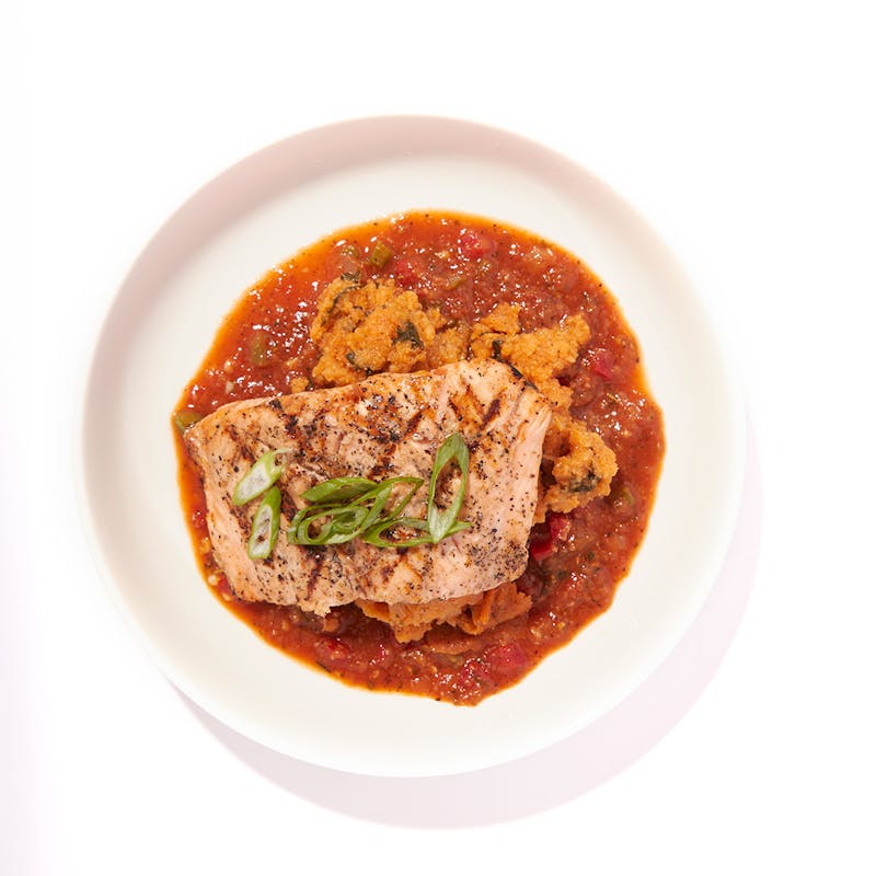 Savor salmon braised in a Haitian tomato-based sauce made with red and green bell peppers and adobo seasoning. The flavorful fish is complemented by a spinach-tomato polenta and garnished with fresh green onions.