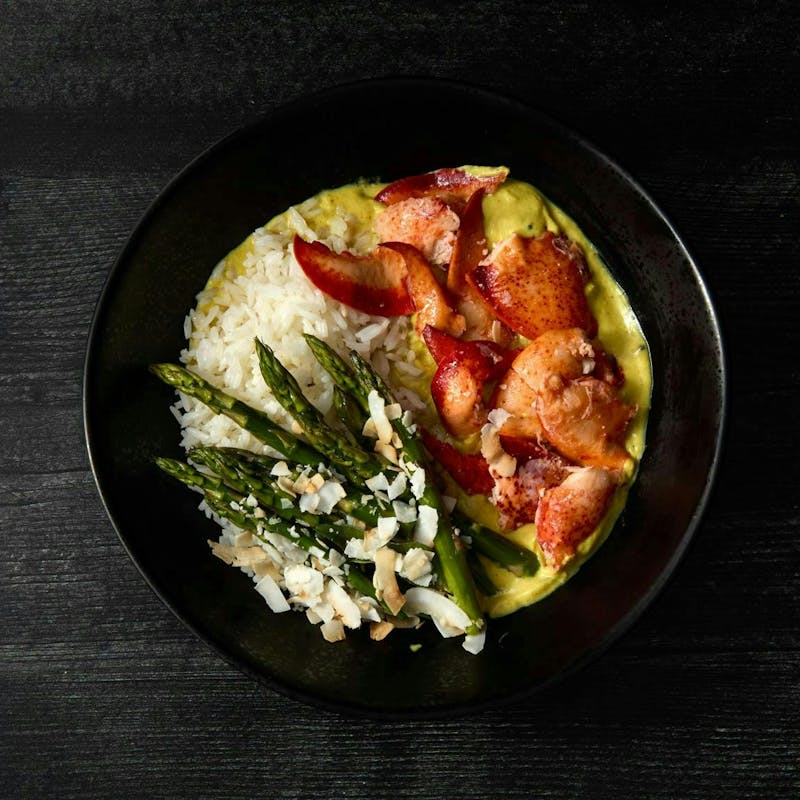 Coconut Milk, Lobster, Asparagus, Jasmine Rice, Avocado Oil, Coconut Flakes, Ginger, Kosher Salt, Curry Leaf, Tamarind, Mustard Seeds, Turmeric, Espelette Pepper