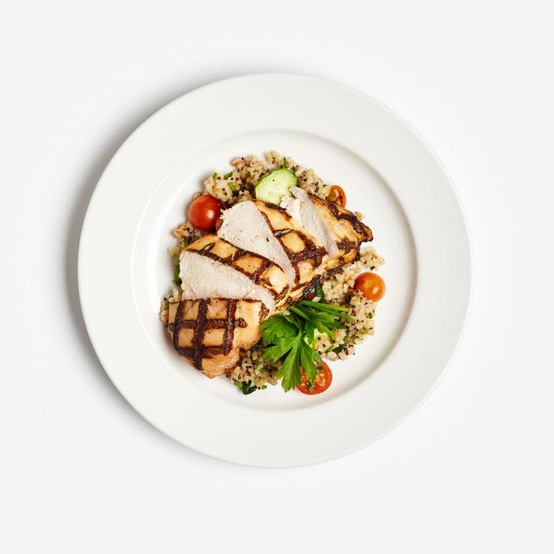 Here's a dish that fuels your body and powers you through even the busiest days. Simply grilled chicken breast accompanies an ancient grain salad packed with flavor and nutrition. Farro and tri-color quinoa are mixed with vegetables, fresh herbs, and a simple vinaigrette for good, clean food at its finest.