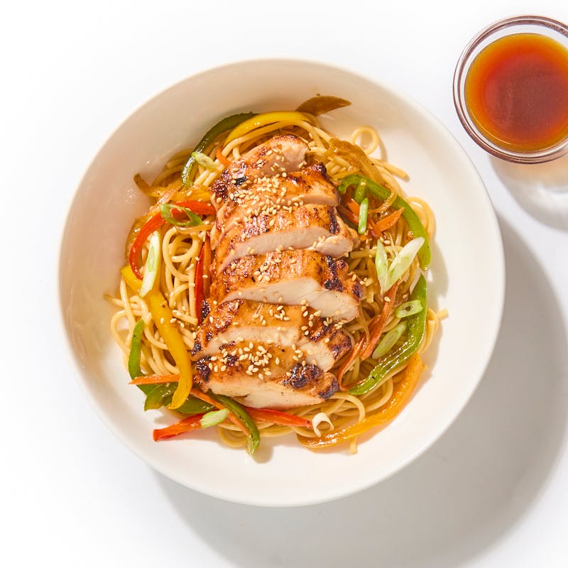 Sweet and tangy braised chicken meets umami garlic sauce in these flavor-packed Lo Mein noodles. The crunch of the carrots and peppers gives texture to this light yet satisfying dish.