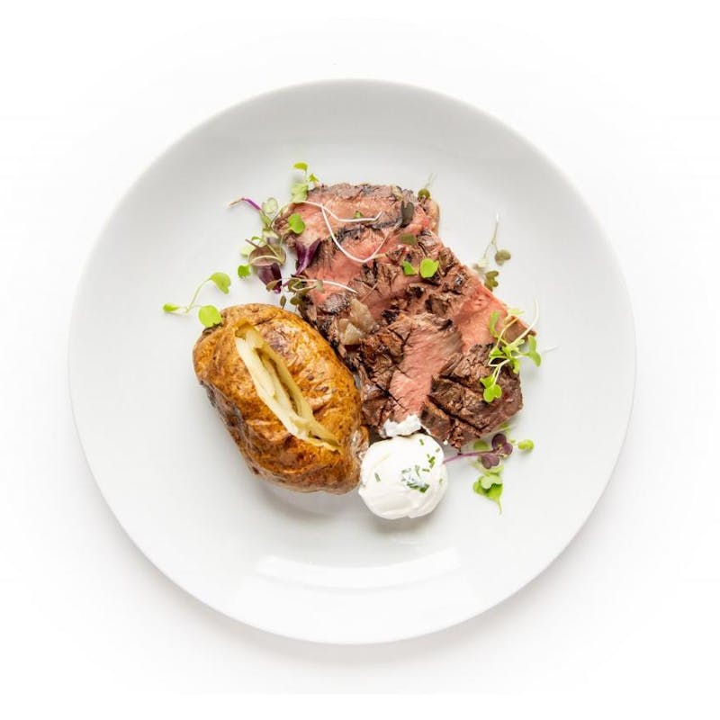 Steak lovers, rejoice. Few cuts take to a marinade like flank steak—and Chef Chris uses his own top-secret blend to make the most of it. After an overnight soak, the steak is grilled, hand-sliced by a real carving chef, and laid over a bed of caramelized onions. On the side: an herb-baked potato with a generous dollop of chive sour cream for that classic steakhouse touch. Chef recommends microwaving for best results.