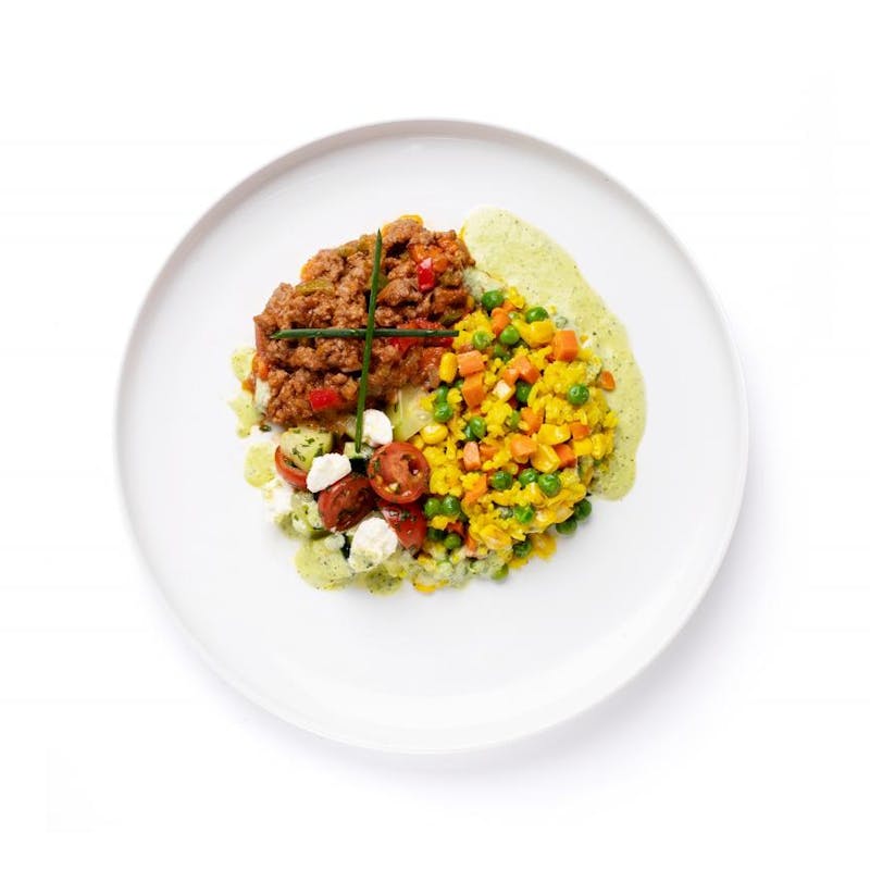 This comforting bowl of goodness from Chef Nahika packs some serious flavor into a small package. The bowl features ground lamb that's been braised with tomatoes, peppers, West Indian spices, and fresh herbs like mint and parsley. The lamb is plated on a bed of yellow turmeric-infused rice with peas and carrots, as well as a refreshing side salad of tomatoes, cucumbers, and even more fresh herbs. An herbaceous yogurt sauce that packs just a little bit of heat ties the whole bowl together.