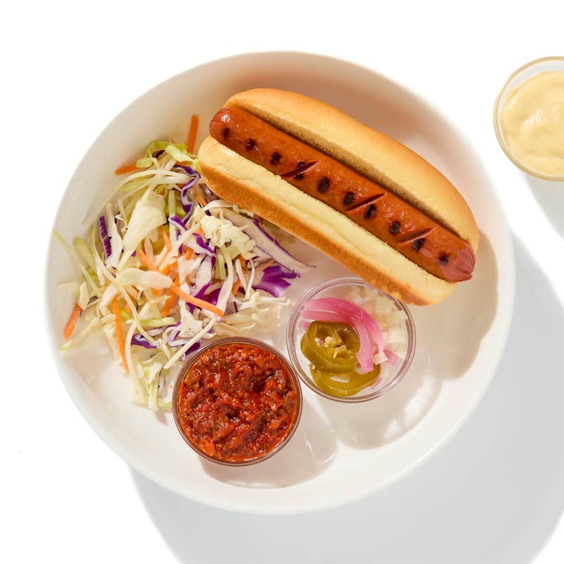 Chef Maribel crafts a plate that nods to her mother's flavorful and resourceful Tex-Mex cooking. After making her signature chile con carne enchiladas, Chef’s mother would save the rich, smoky sauce for the next day and pour it over classic beef hot dogs. Topped with cheese, onions, and jalapeños, it became the perfect mashup of Mexican tradition and American comfort. Savor all those flavors in this dish, completed with cabbage slaw and dressing.