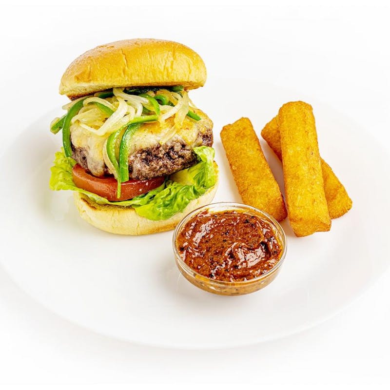 Yucca Fries, Cheese, Pepperjack, Sliced, Baby Romaine, Canola and Olive Oil Blend, Chipotle Powder, Plum Tomato, Red Mole Paste, Onion, Kosher Salt, Jalapeno Peppers, Mayonnaise, Ground Beef, Ancho Powder, Canola Oil, Potato Bread