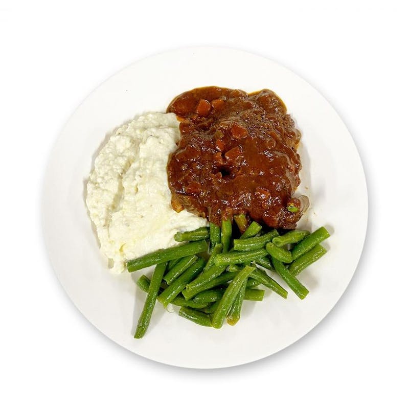 This dish is pure Italian comfort. Pork shank is slowly braised in a savory sauce made with tomato, herbs, and red wine, then plated atop a bed of citrusy, fluffy lemon polenta with a side of garlicky green beans. Hearty and warming, you can taste the love in every bite.