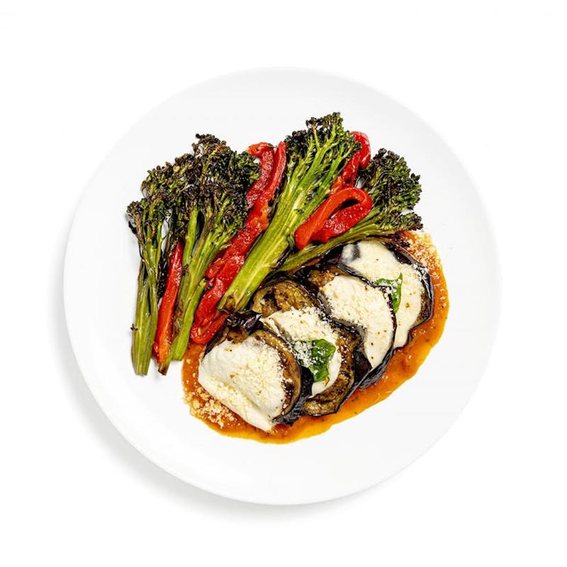 Chef Chris wanted to come up with a healthier alternative to the deep-fried eggplant you typically see on Italian menus, but without sacrificing any of the flavor. He decided on simply roasted thin slices of seasoned eggplant, layered Napoleon-style with hand-sliced fresh mozzarella, and served with fresh roasted tomato sauce. Garlicky broccolini and roasted peppers round out this filling and delicious meal, which also turned out to be low-carb and gluten-free in the process!