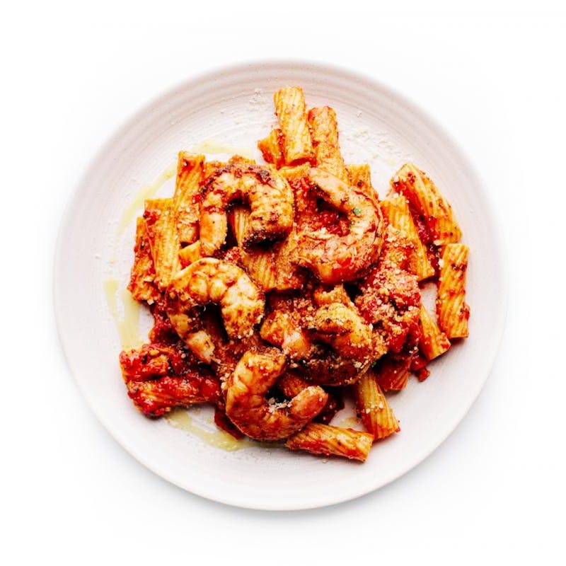 A spicy seafood delight! Shrimp and rigatoni pasta are tossed in a spicy Arabbiata sauce and topped with parmigiano cheese.