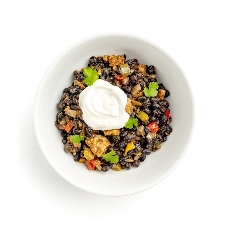 Canola and Olive Oil Blend, Canned Black Beans, Plum Tomato, Cumin, Golden Raisins, Cashews, Garlic, Sour Cream, Onion, Turkey, Chicken Base, Chipotle in Adobo, Blackened Seasoning, Red Bell Pepper