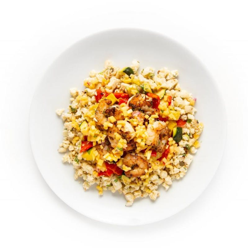 Mango, Canola and Olive Oil Blend, Extra Virgin Olive Oil, Red Onion, Mint, Shrimp, Black Pepper, Cilantro, Garlic, Zucchini, Kosher Salt, Yellow Squash, Coconut Milk, Five Spice, Lime, Green Onion, Orange Juice, Ginger, Sweetened Coconut Flakes, Red Bell Pepper, Sweet Chili Sauce, Cauliflower