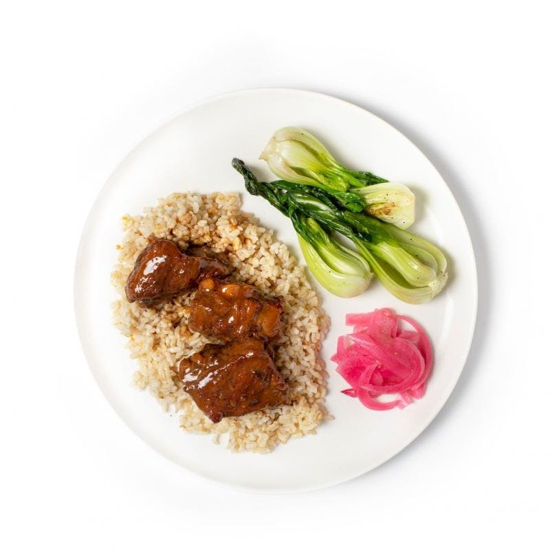 Pork Spare Ribs, Bok Choy, Jasmine Rice, Onion, White Vinegar, Garlic, Light Soy Sauce, Canola and Olive Oil Blend, Light Brown Sugar, Red Onion, Lemon Juice, Kosher Salt, Canola Oil, Bay Leaf, Black Pepper