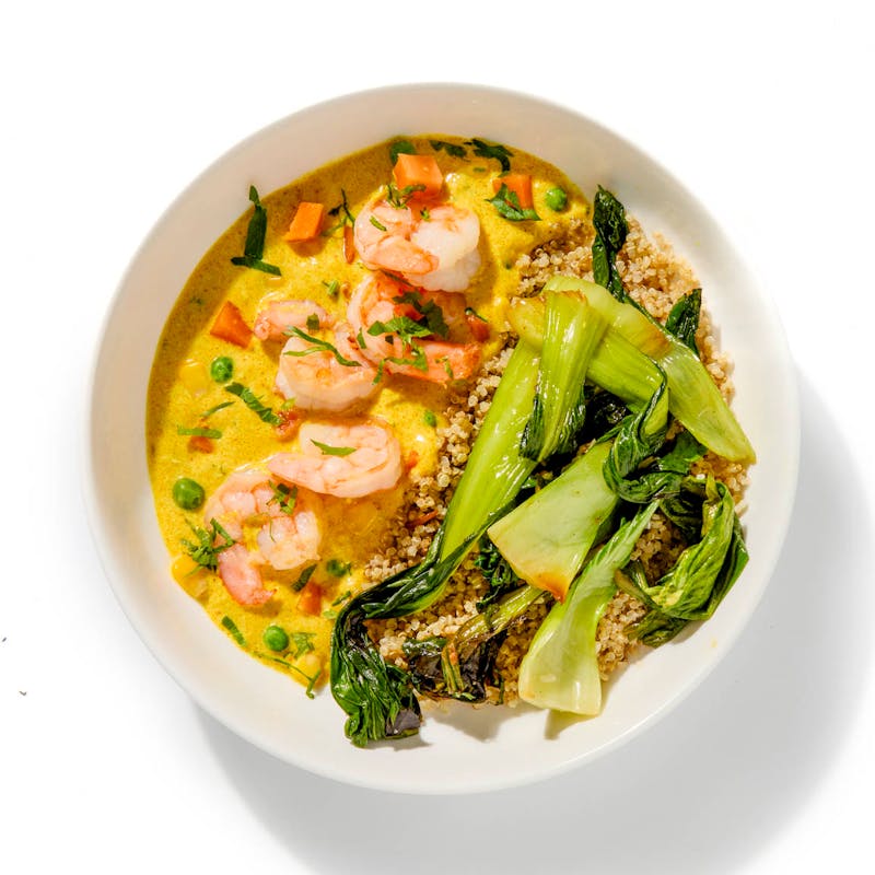 Bok Choy, Shrimp, Coconut Milk, Quinoa, Corn, Carrots, Onion, Canola and Olive Oil Blend, Garlic, Green Peas, Carrots, Golden Curry Paste, Ginger, Fish Sauce, Aji Panca Pepper, Lemongrass, Kosher Salt, Chicken Bouillon, Spice, Parsley, Dried, Black Pepper, Turmeric