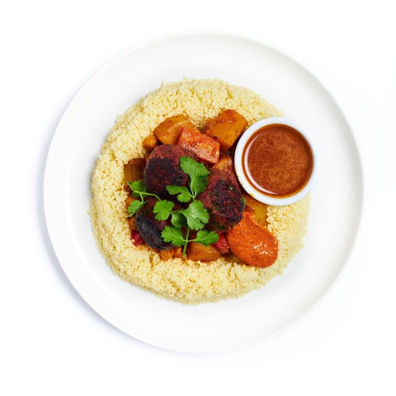 Warm up with this richly spiced, Moroccan-inspired dish! Plant-based kefta, a.k.a. Middle Eastern meatballs are made with Impossible Meat and lots of herbs and Moroccan spices. They pair perfectly with hearty couscous and harissa-seasoned stewed vegetables. Eating vegan never tasted so good!