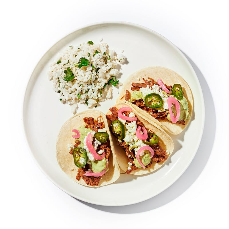 Chef Esther takes tacos to a whole new level with this dish! Tender brisket is braised to perfection with a hint of spiciness that will keep you coming back for bite after bite, especially once it's tucked into corn tortillas and topped with queso fresco and pickled onions and jalapeños. Served with a side of cilantro-lime rice and a velvety smooth avocado crema, this dish is simply irresistible.