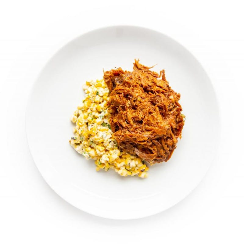 Chef Chris doesn’t mess around with pulled pork. His version starts with pork shoulder slow-cooked in apple juice and spices for over eight hours, then hand-pulled and folded into a smoky, house-made chipotle BBQ sauce. On the side: a grilled corn salad inspired by the esquites he grew up eating in Sunset Park, Brooklyn—charred corn tossed with mayo, lime, jalapeño, cilantro, and Cotija cheese. Heat it all up, or keep the salad cold for contrast.