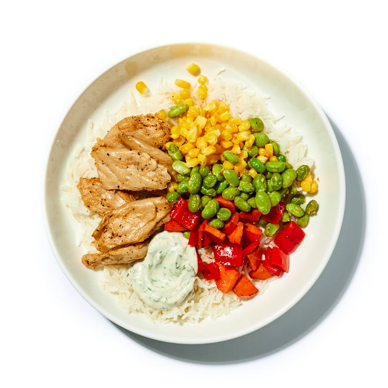 Indulge in what Chef Cami has dubbed her "Chicken Strip Delight"—a plate of pure vegan comfort food. Seasoned vegan chicken strips are grilled and served alongside fluffy rice, garlicky edamame, a refreshing chickpea and veggie salad, and smoky grilled corn. Drizzled with a creamy vegan ranch sauce, this plate has everything you need to satisfy your cravings while keeping it plant-based.