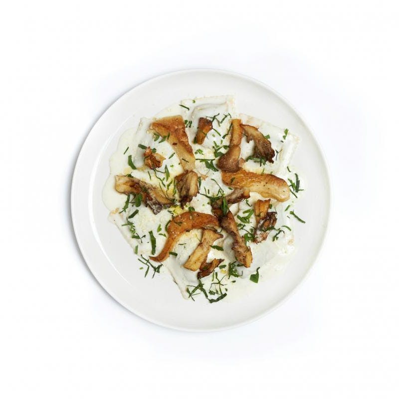 This is simple yet elegant vegetarian food at its finest. Fresh pasta sheets are stuffed with mushrooms and pressed into ravioli, then smothered in a rich cream sauce with sautéed cremini and button mushrooms. To add even more luscious umami flavor, Chef Dustin adds white truffle oil and truffle shavings to the sauce to take this dish over the top.