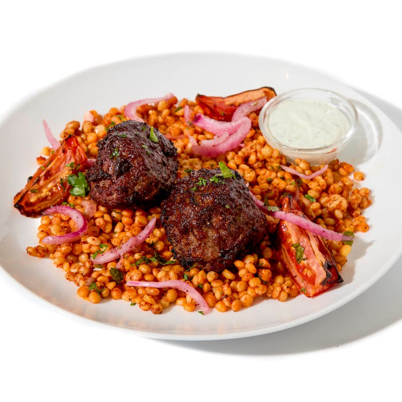 Chef Einat's beef meatballs are packed with herbs like mint, oregano and parsley, and pair perfectly with a creamy tzatzaki sauce on the side. Blistered cherry tomatoes add sweetness to the plate, which is made complete with a side of spiced pearl couscous. Enjoy a comforting, well-rounded taste of the Mediterranean.