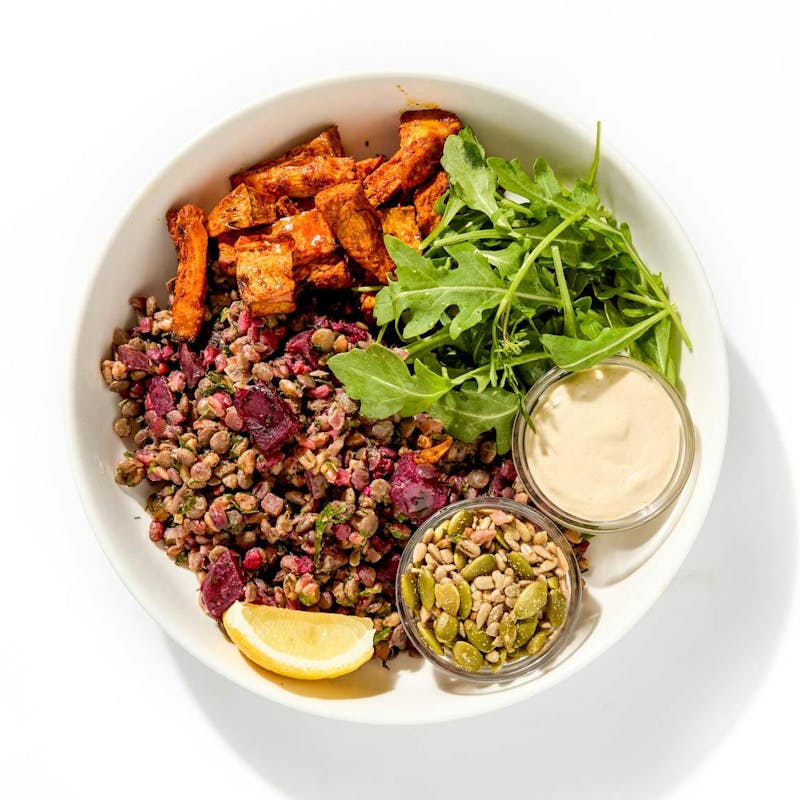 A bright, flavorful, healthy bowl featuring zesty grilled jackfruit rubbed in a house-made shawarma spice blend and griddled with olive oil. Vegan protein comes from lentils and chewy farro, tossed with ruby-hued, heart-healthy beets and fresh herbs, then finished with a lemon-cumin dressing. Served with a side of creamy tahini sauce and a sprinkle of toasted pumpkin and sunflower seeds for extra healthy fats. This dish is rich in resistant starch, fiber, and vitamins, and will leave you feeling nourished and satiated—yet light and energized. Enjoy hot or cold!