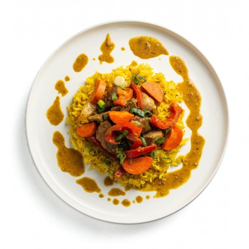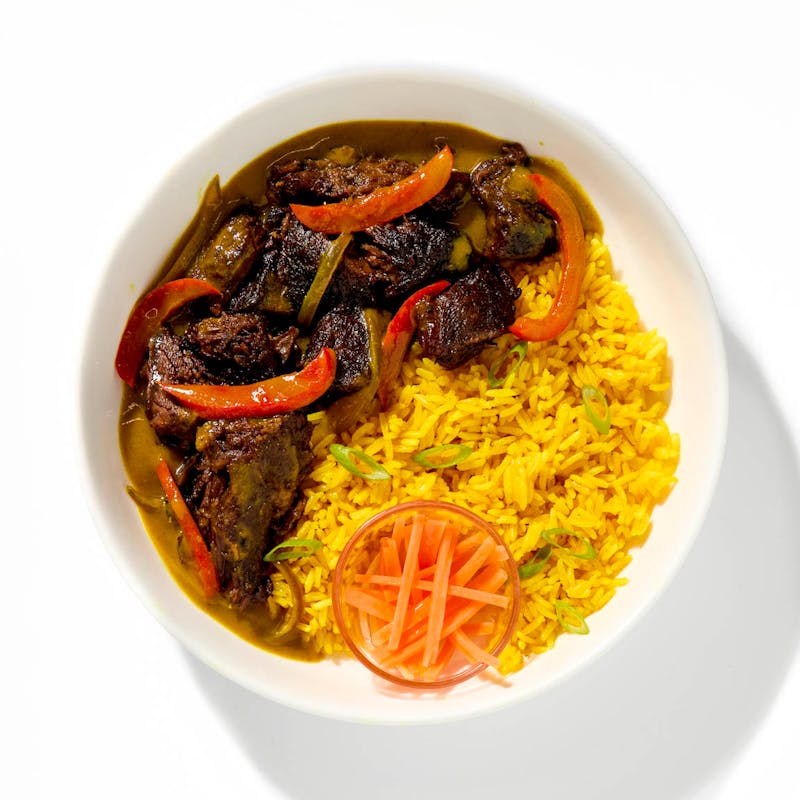 Beef Chuck, Coconut Milk, Jasmine Rice, Red Bell Pepper, Red Onion, Spice Blend, Carrots, White Vinegar, Lemongrass, Sugar, Sunflower Oil, Coconut Oil, Green Onion, Chicken Base, Vegetable Base, Kosher Salt, Kaffir Lime, Gum, Xanthan, Turmeric