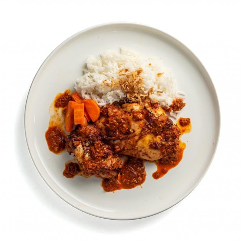 Tender chicken thighs are marinated and baked in a spicy red chili sauce infused with Bumbu Merah, a traditional Indonesian spice paste made with red chili, shallots, garlic, and tomatoes. Served on a bed of aromatic jasmine rice alongside tangy pickled carrots, alongside a side of creamy chili sauce, this dish is guaranteed to spice up any weeknight.