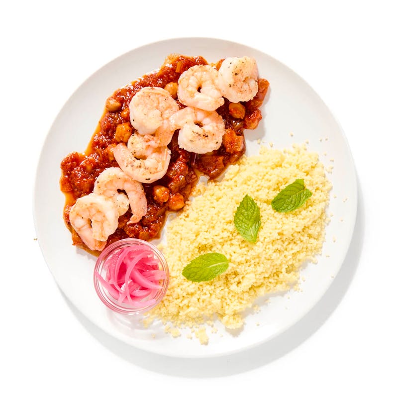 Canola and Olive Oil Blend, Extra Virgin Olive Oil, Red Onion, Mint, Coriander, Shrimp, Black Pepper, Cumin, Garlic, Sweet Paprika, White Wine Vinegar, Sugar, Kosher Salt, Canned Chickpeas, Orange Juice, Couscous, Canned Tomato, Harissa