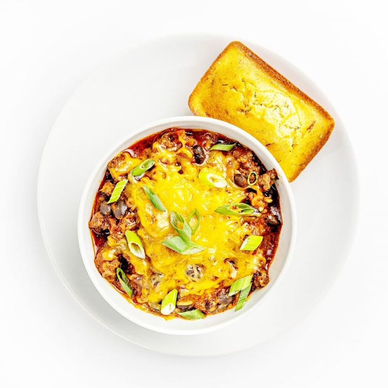 This warming beef and black bean chili is perfect for a cool night. It's served with a soft cheddar and corn muffin to soak up all the savory flavors.