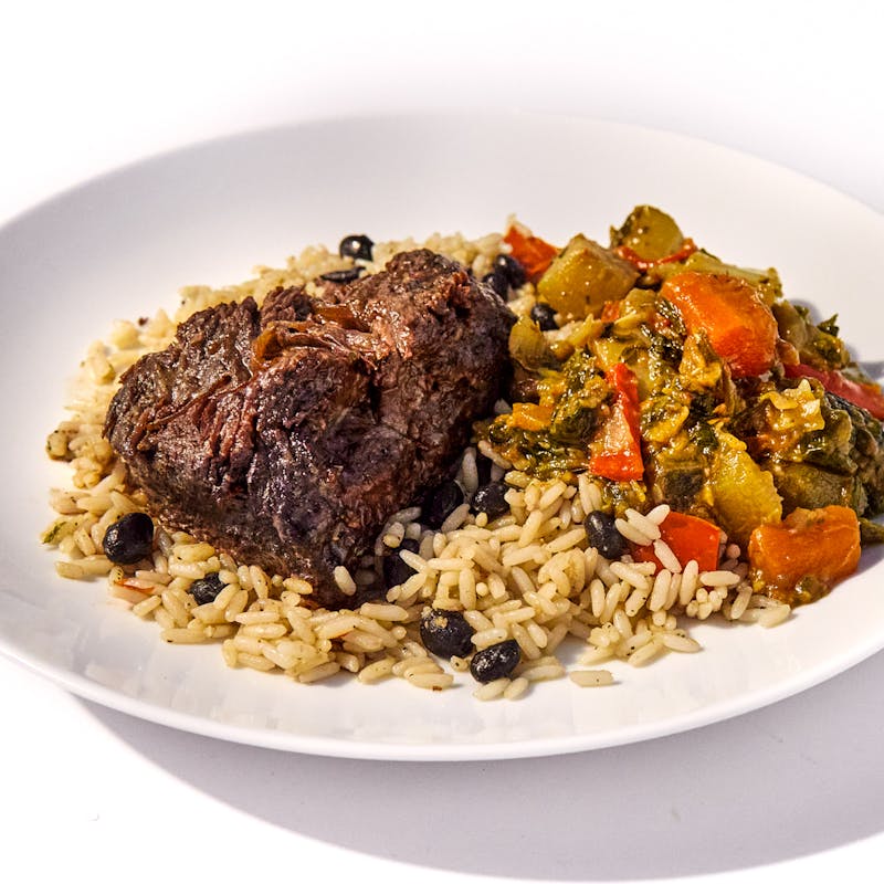 Enjoy a taste of one of Chef Vanessa's signature dishes. Boneless beef short ribs are braised in a rich and spicy sauce until super rich and tender, then served with Haitian-style stewed vegetables—known as legumes—as well as black beans and rice. One bite and you'll see why this dish earned Chef Vanessa top spot on Rocco's Dinner Party on Bravo.