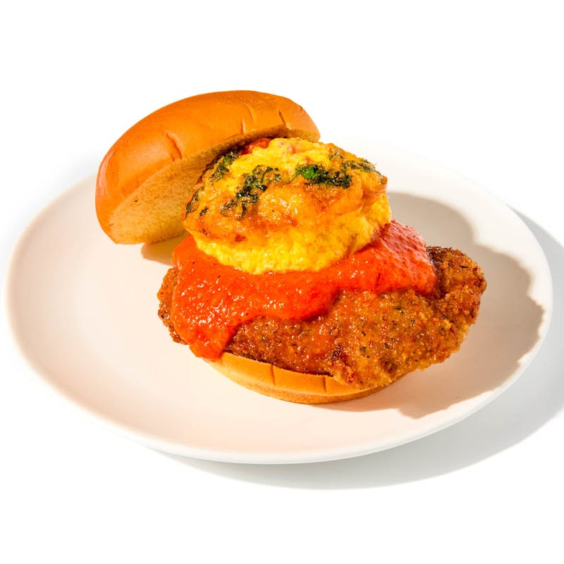 A breakfast sandwich you’ll be thinking about long before morning. Here, golden, panko-crusted chicken breast meets a Southwestern-style omelet, packed with sautéed red bell pepper, onion, cheddar cheese, and a touch of smoky paprika. It’s served on a soft potato bun, with a side of Chef Vanessa’s fire-roasted pepper sauce adding a drizzle of heat.