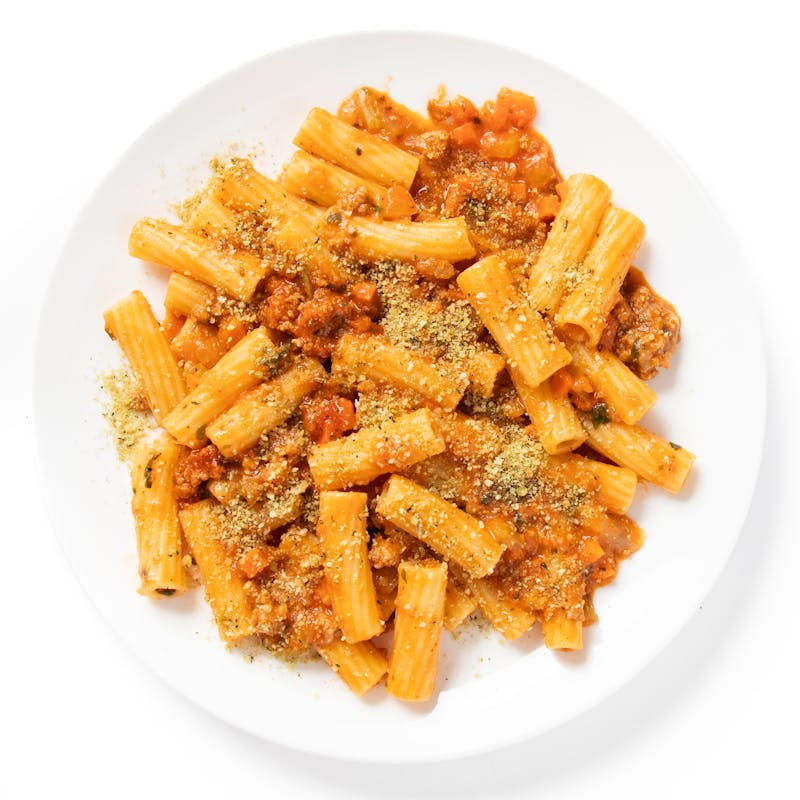 Veg, Tomatoes, Whole, Canned, Italian, Canola and Olive Oil Blend, Bay Leaf, Butter, Extra Virgin Olive Oil, Carrots, Celery, Onion Powder, Garlic Powder, Tomato Paste, Garlic, Onion, Kosher Salt, Ground Turkey, Ground Italian Sausage, Chicken Base, Thyme, Rigatoni, Crushed Red Pepper, Basil, Panko Breadcrumbs