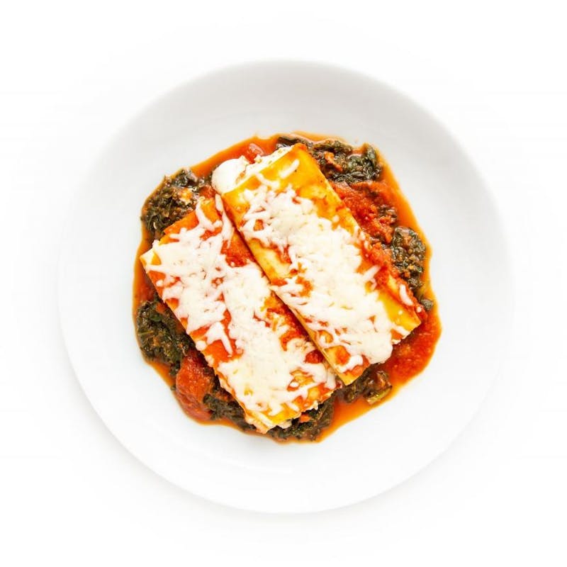 An Italian favorite, manicotti is stuffed with a four-cheese blend and baked on top of tomato-braised hearty greens, and simmered in a slightly spicy arrabbiata sauce. Topped with mozzarella and parmesan cheese and broiled until bubbling, this classic dish is as comforting as it is delicious.