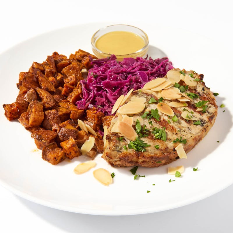 Bacon, Canola and Olive Oil Blend, Sweet Potatoes, Almonds, Onion Powder, Garlic Powder, Pork Loin, Black Pepper, Chili Powder, Honey, Dijon Mustard, Kosher Salt, Cider Vinegar, Tabasco Sauce, Thyme, Lemon Juice, Red Cabbage, Italian Parsley