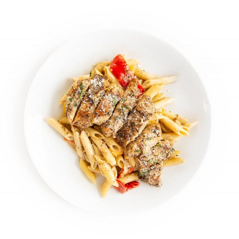Chicken Breast, Penne, Whole Milk, Heavy Cream, Parmesan Cheese, Hot Jerk Sauce, Onion, Green Bell Pepper, Yellow Bell Pepper, Red Bell Pepper, Worcestershire Sauce, Chicken Base, Butter, All Purpose Flour, Canola and Olive Oil Blend, Garlic, Garlic Powder, Allspice, Black Pepper, Kosher Salt