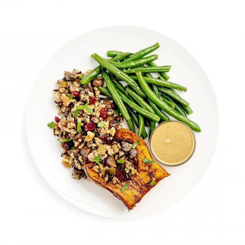 This is a classic American inspired dish that warming and comforting, perfect for the harvest season and colder months, and deliciously guilt-free! Butternut squash halves are caramelized in the oven with ginger and cinnamon, and served with a wild rice and mushroom stuffing with sage, cranberries and walnuts and a side of garlicky green beans.