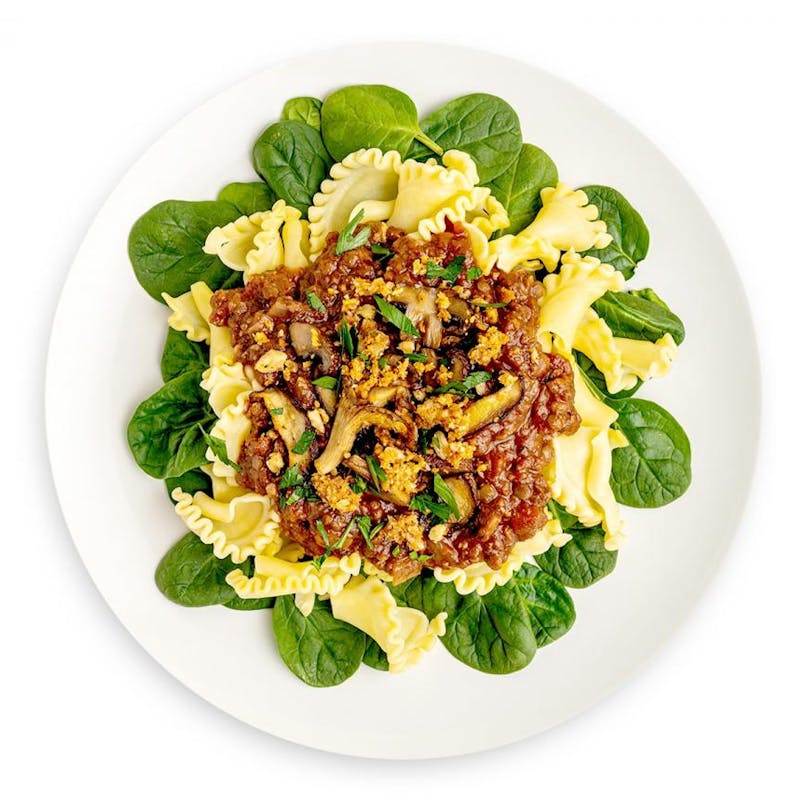 This comforting pasta dish is so full of umami, you won't even miss the meat. Chef Emily makes a rich, plant-based bolognese sauce with a mixture of wild mushroom and red lentils, then serves it over a bed of fresh spinach and Italian Sfoglini organic pasta. To take it to the next level, Chef tops the bolognese with crispy roasted mushrooms and a crunchy walnut-and-herb breadcrumb topping. This dish is so delicious and hearty, it's sure to satisfy vegans and omnivores alike.