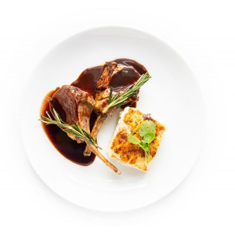 This dish features pasture-raised Australian lamb grilled to perfection. It is served with a red wine reduction and a creamy potato gratin spiked with Parmigiano Reggiano and finished with a silky reduction of cabernet sauvignon. The lamb is humanely raised without antibiotics or added hormones for a clean, natural flavor and remarkable tenderness.
