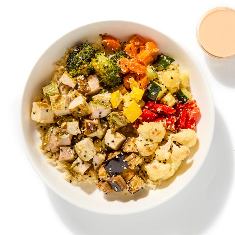If Chef Chris was forced to choose a favorite meal, he says this one might just be it. Simple yet hearty, it brings together grilled chicken, roasted vegetables, and nourishing brown rice. What separates this bowl from the rest is Chef’s secret spicy tahini sauce, made to drizzle on absolutely everything. Topped with sesame seeds, this dish is one you'll want to eat on repeat.
