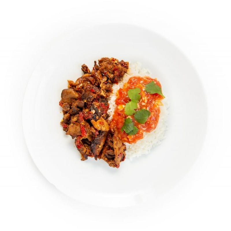 Spicy Broad Bean Paste, Sesame Oil, Yellow Bell Pepper, Baking Soda, Onion Powder, Garlic Powder, Gochugaru, Cilantro, Corn Starch, Whole Canned Tomatoes, Egg, Sugar, White Pepper, Kosher Salt, Shaoxing Wine, Kohuho Rice, Soybean Paste, Green Bell Pepper, Red Bell Pepper, Canola Oil, Ginger Powder, Sichuan Pepper Corn Oil, Pork Shoulder
