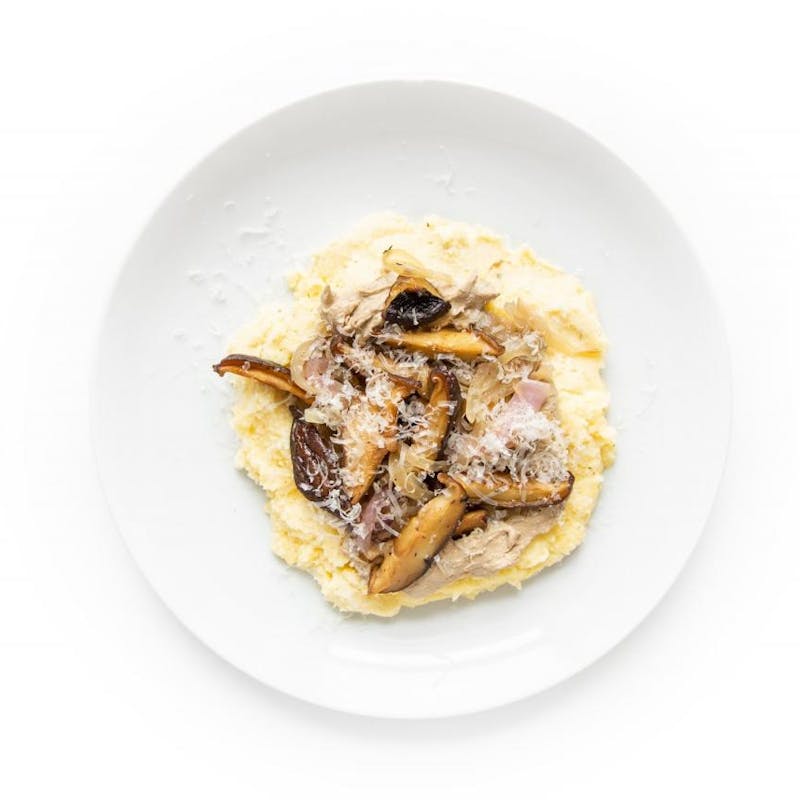 Cozy up to a warm bowl of this comforting vegetarian dish that puts mushrooms in the spotlight. Creamy, dreamy polenta is made with porcini mushroom broth for umami and Grana Padano cheese for salty richness. The polenta is paired with mixed mushrooms like cremini and shiitake that are sautéed and cooked down until they resemble an Italian ragu. A dollop of porcini mushroom-infused cream on top is the finishing touch on this rich, deeply savory meal.