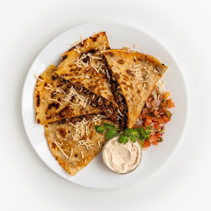Savor an explosion of flavors that will leave you asking, "Wait, is this really vegan?" Chef Ivy takes her beloved vegan chorizo and black chili and builds it into a hearty quesadilla, packed with vegan cheddar cheese and griddled in a gluten-free flour tortilla. A vibrant pico de gallo adds a burst of freshness, while the tangy vegan chile-lime crema enhances the whole meal.