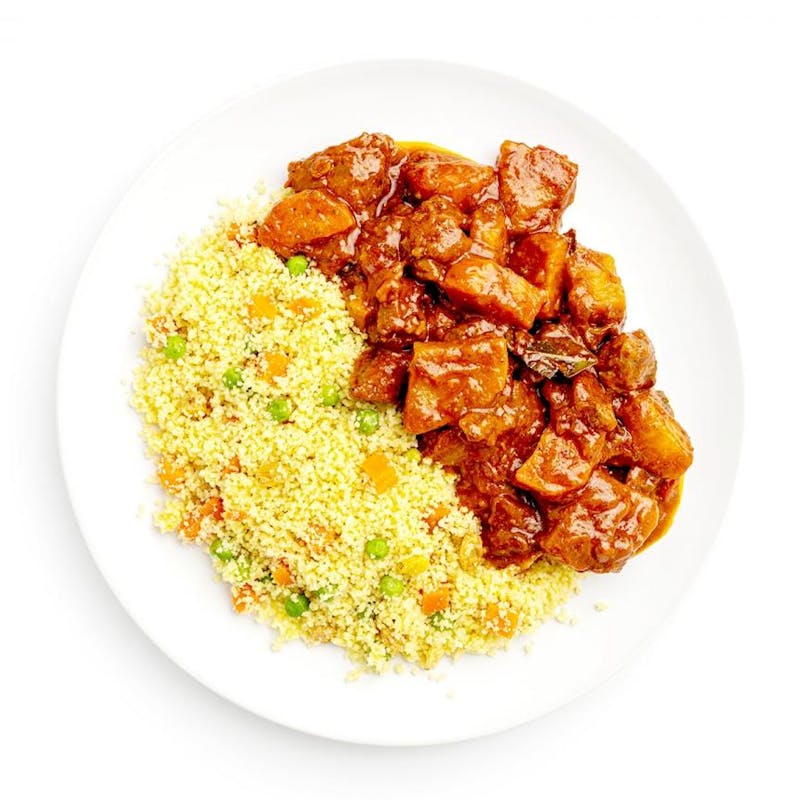 Canola and Olive Oil Blend, Extra Virgin Olive Oil, Carrots, Plum Tomato, Golden Raisins, Tomato Paste, Garlic, Potato, Onion, Kosher Salt, Chicken Base, Green Bell Pepper, Red Bell Pepper, Couscous, Lamb
