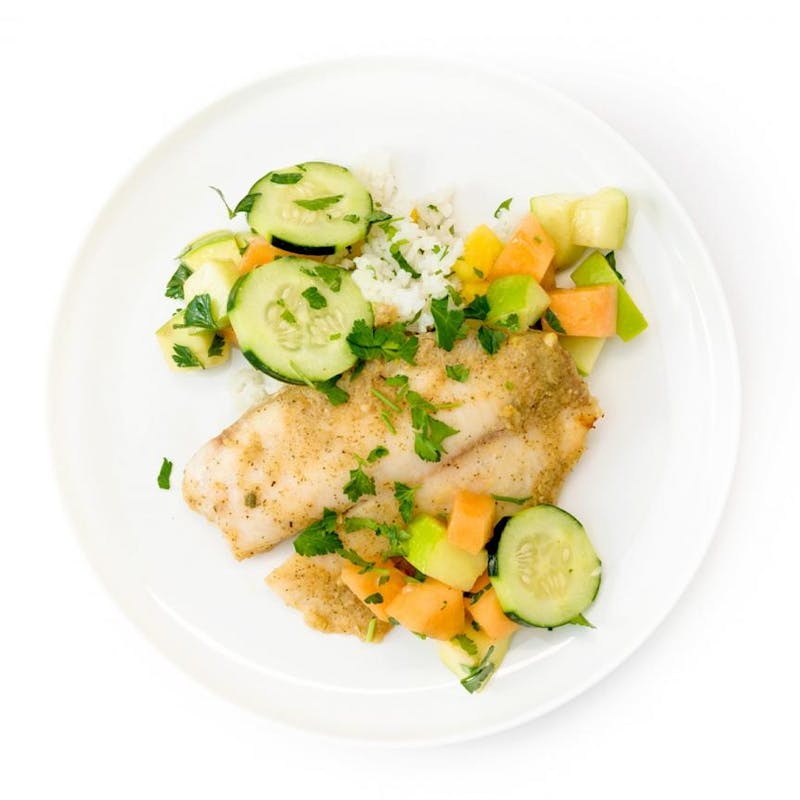 Shrimp Base, Pineapple, Black Pepper, Cilantro, Tilapia, Garlic, Oregano, Onion, Jasmine Rice, Kosher Salt, Cucumber, Granny Smith Apple, Lime Juice, Cantaloupe, Canola Oil, Chicken Stock